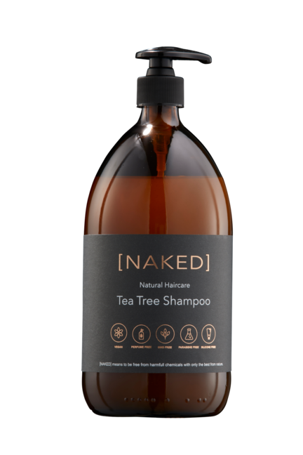 NAKED NATURAL HAIRCARE –  Tea Tree Shampoo, stabiliserer hårbundens bakterieflora, fjerner det syge cellelag i øverste hudlag, skaber balance i syrekappen og stimulerer blodcirkulationen.